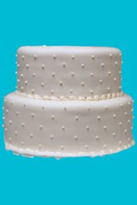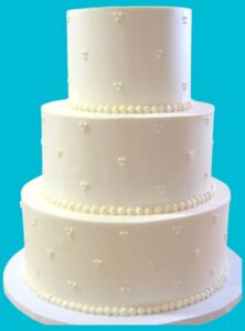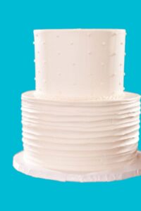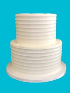 A delicious vanilla, chocolate, or marble cake (no filling) covered in buttercream with a simple design, featuring a silver, gold, or white ribbon around each tier, and presented on a silver or gold cardboard base.